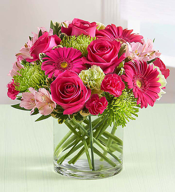 EXCLUSIVE Cheerful, colorful and oh-so chic, our latest creation is like a celebration in a vase! Bold pops of hot pink roses, Gerbera daisies and mini carnations mingle with cool lime green blooms for lots of playful, flirty touches. Hand-gathered into a sleek, modern compact cylinder vase, it’s a fun floral surprise that’s positively perfect for big parties or everyday pick-me-ups!